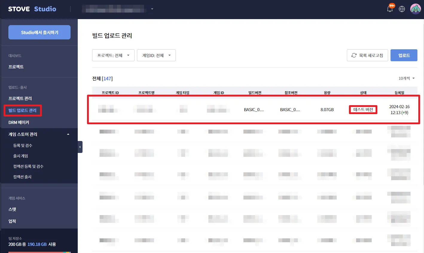 테스트 빌드 여부는 스튜디오 대시보드 ⇒ 빌드 업로드 관리 메뉴에서 확인 가능합니다. (하단 참고)
