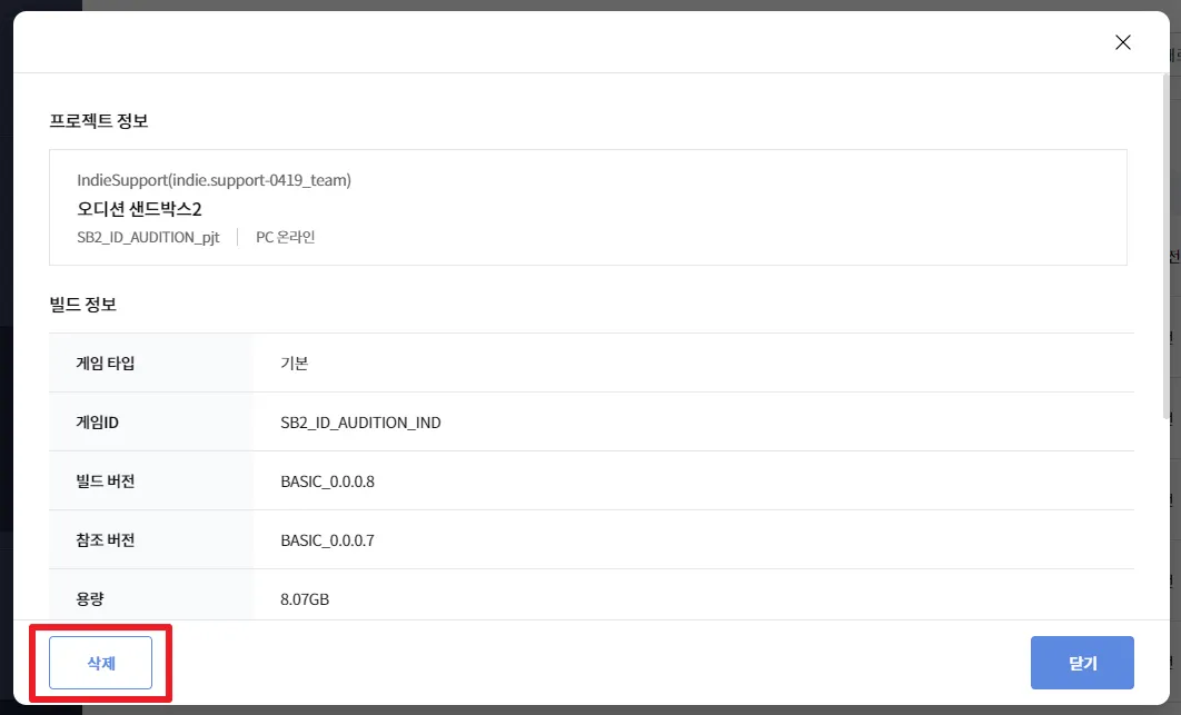 한번도 출시되지 않은 게임 빌드 (테스트 빌드)만 삭제가 가능합니다.
