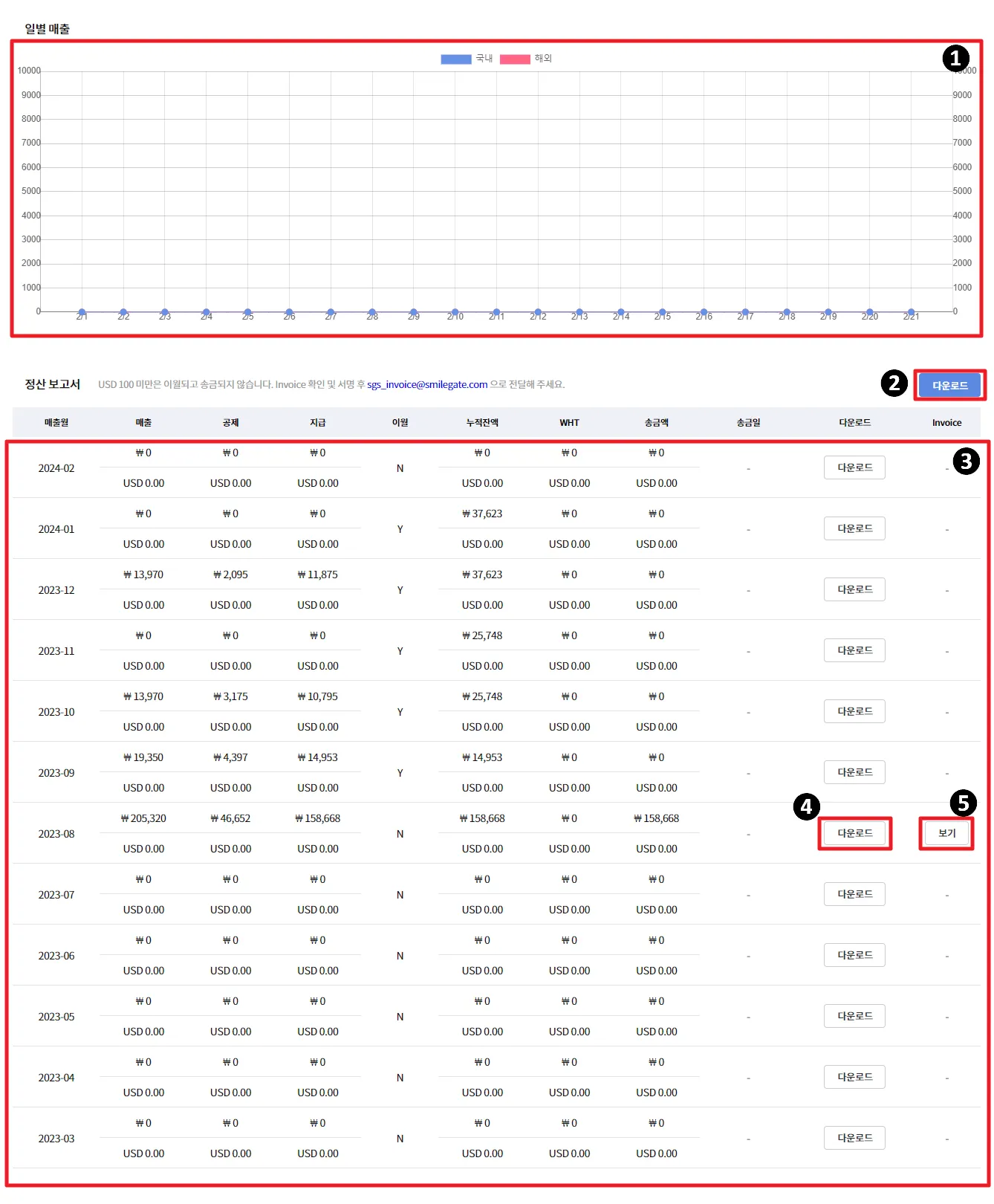 ❹ | 해당 월에 대한 정산 보고서를 다운로드 받을 수 있습니다. |