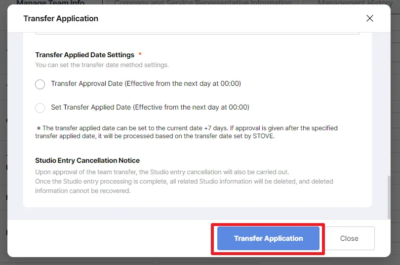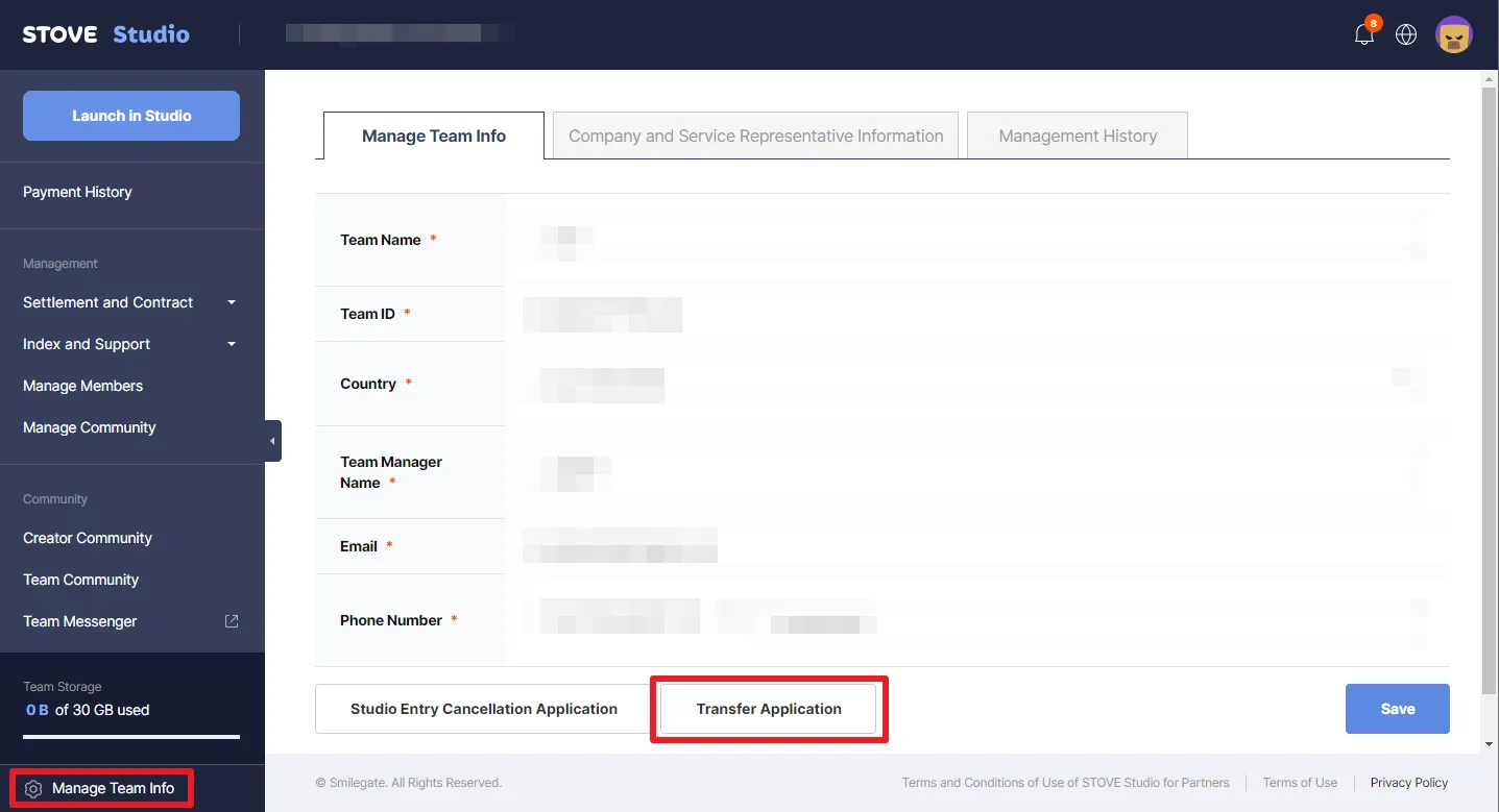 In STOVE Studio, on the bottom left, you can find Manage Team Info, when clicked, you can find Transfer Application (see below)