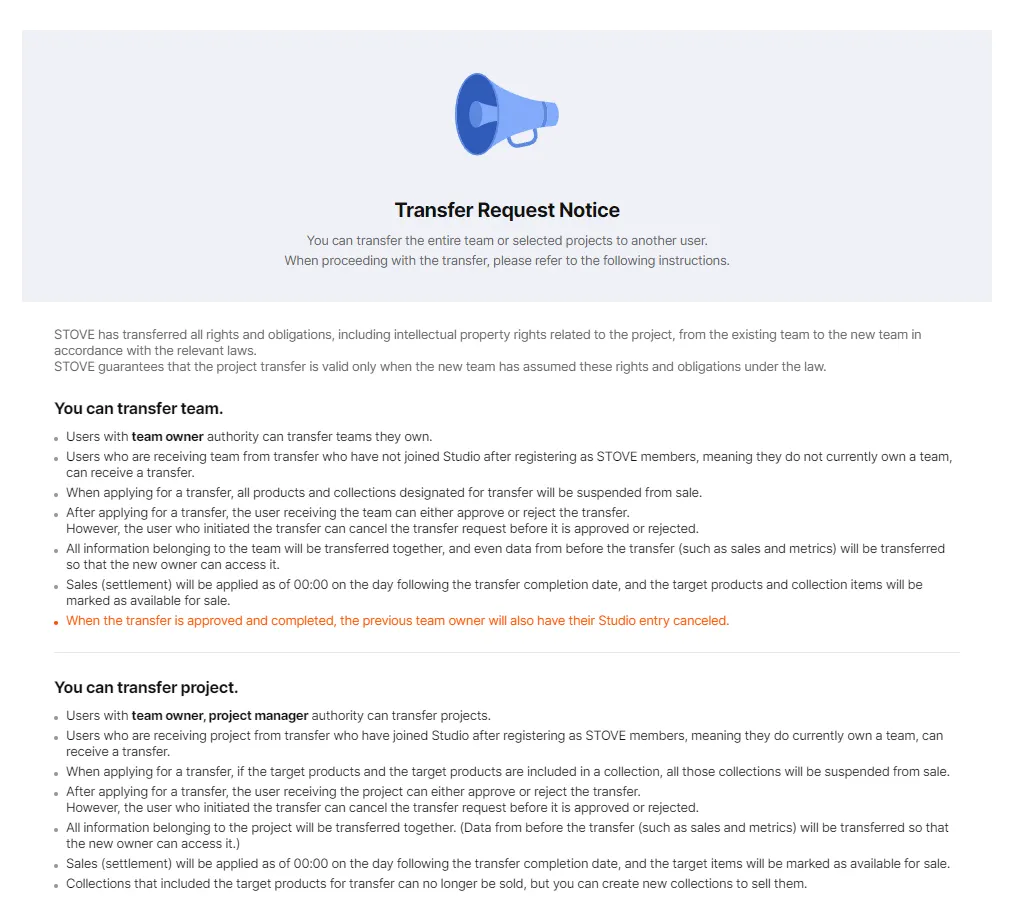 There will be times when project(s) need to be transferred, due to the change of publisher and etc. Below guideline explains how you can transfer project to another team.
