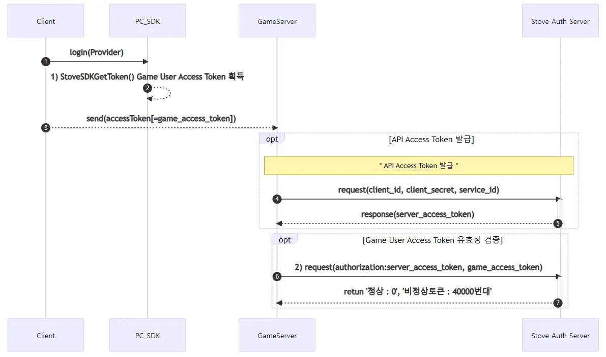 Client가 Game Server에 Game User Access Token을 전달하면 Game Server는 이를 다시 STOVE Platform(Auth Server)에 전달해 유효한 Token인지 확인하는 인증 과정을 거칩니다.