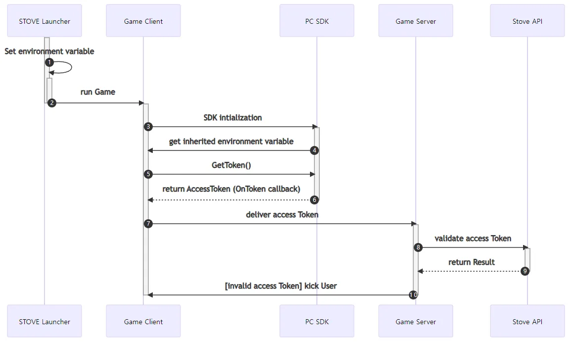 게임 클라이언트는 PC SDK를 통해 GetToken()를 통해 Access Token 획득합니다.(위 그림의 5번 과정)