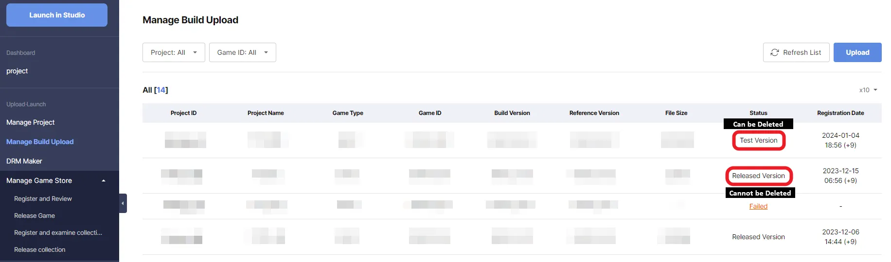 You delete those builds which have not been distributed to the public. (Those builds which have Test Version status in STOVE Studio). Released Versions cannot be deleted.