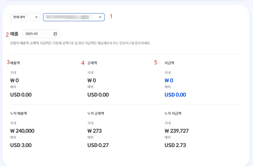 ❸ | 이 달의 매출액을 표시합니다. (한국 원과 미국 달러별 매출이 노출됩니다.)