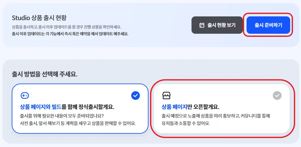 상품 페이지만 오픈할게요. 를 출시 방법으로 선택합니다.
