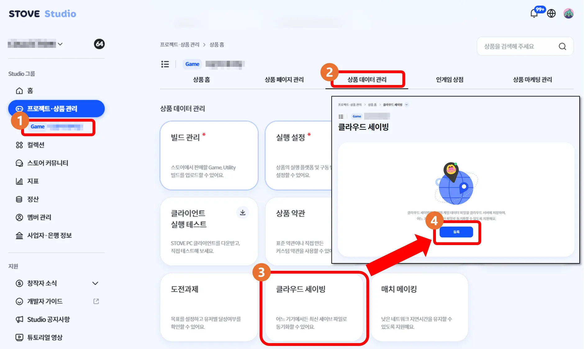 좌측 상단 프로젝트 & 상품 관리에서 클라우드 세이빙 적용할 게임을 클릭합니다.