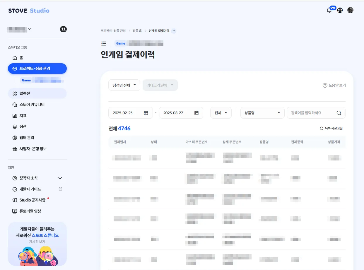 인게임에서 이뤄진 실제 결제 내역을 확인할 수 있습니다.