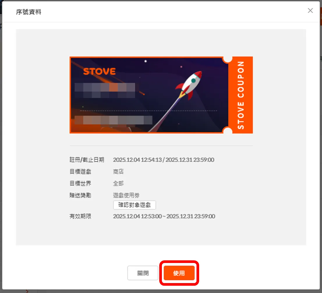 點擊後在出現的畫面中,點擊使用。如果您已進行到這裡,遊戲使用權現在已經啟用了!