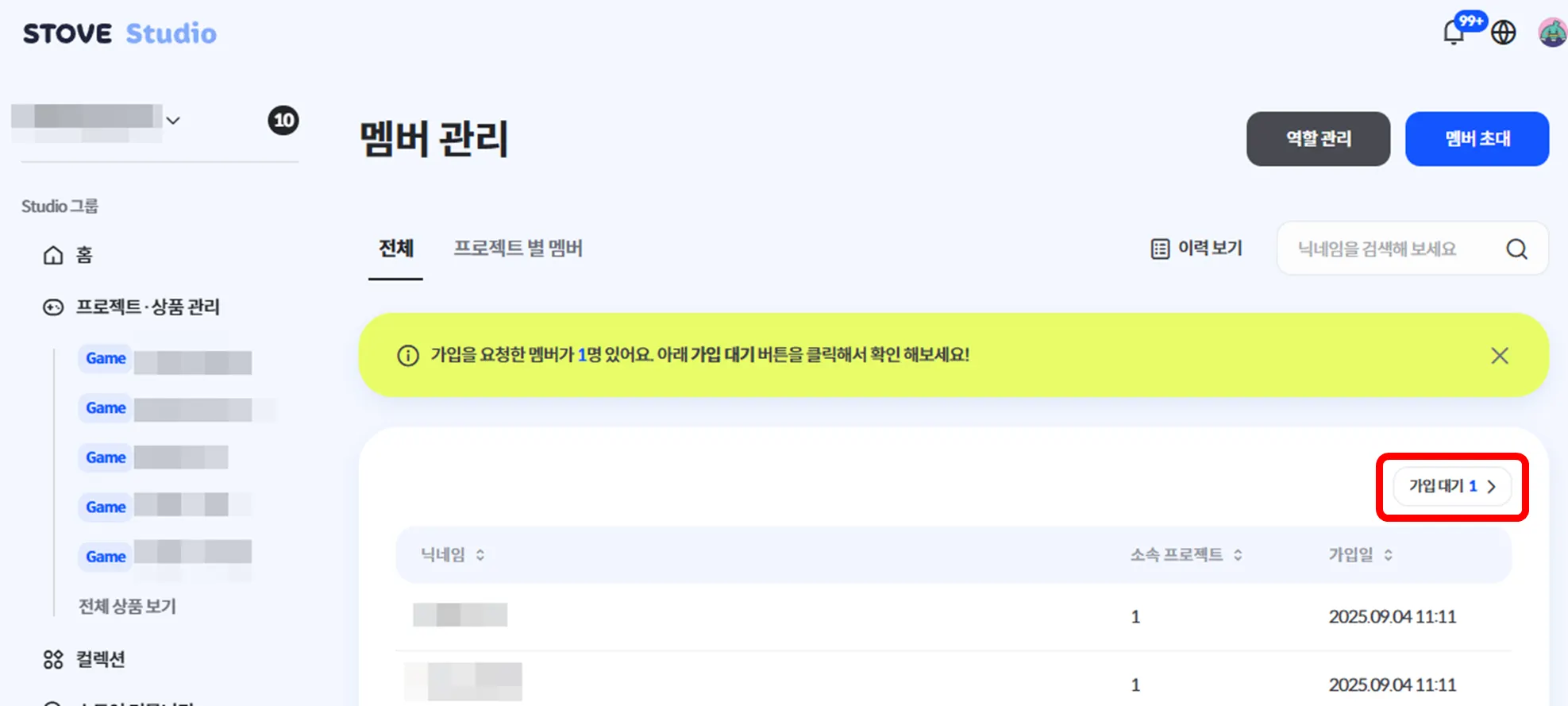 ❶ | 當受邀者提交加入申請後,可在 Studio 首頁右上角通知中查看申請通知。 |