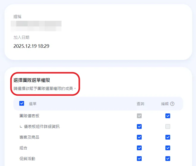 在 成員詳細資訊 的 群組選單權限選擇 區塊,可為該成員授予或收回特定選單的瀏覽或編輯權限。