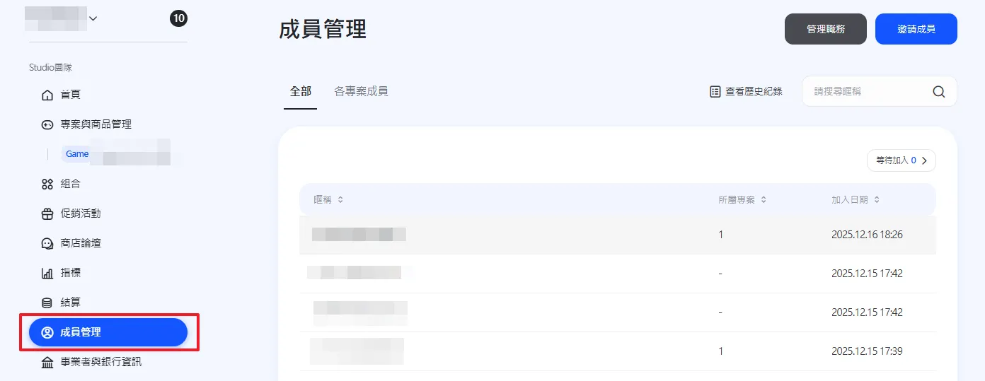 可透過左側導覽列的 成員管理 來管理屬於該群組的成員。