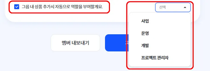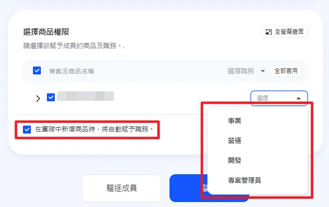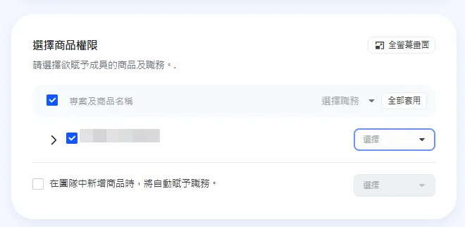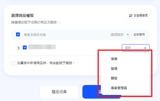 在 成員詳細資訊 的 商品權限選擇 區塊中,可為該成員授予或收回特定專案及商品的角色權限。(※ 角色權限說明見下方)