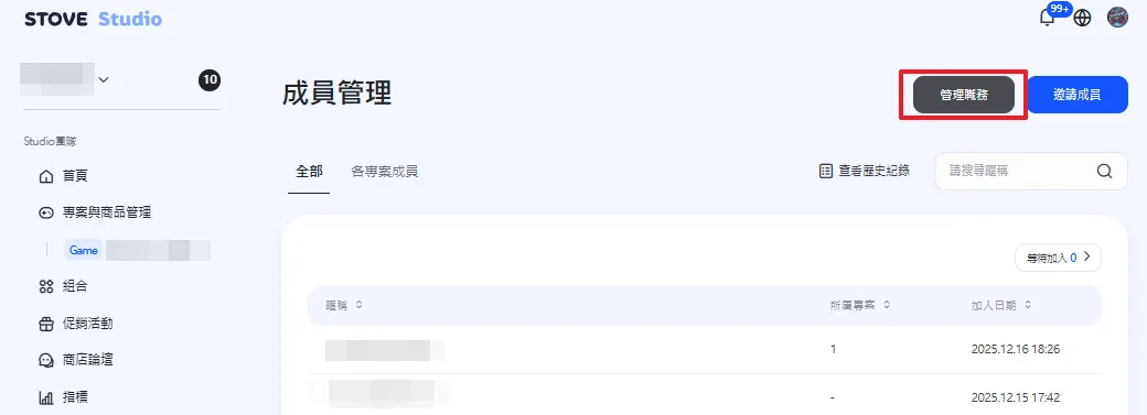 可於「成員管理」頁面右上角,點擊灰色按鈕 管理職務 進行設定。