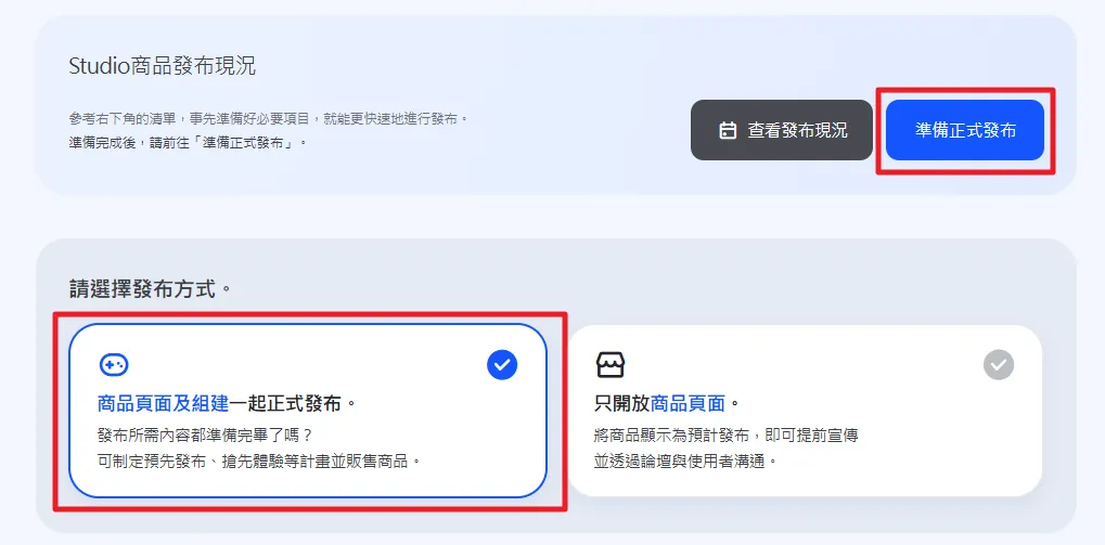 ② 在發布方式中選擇 我要同時發布商品頁與 Build