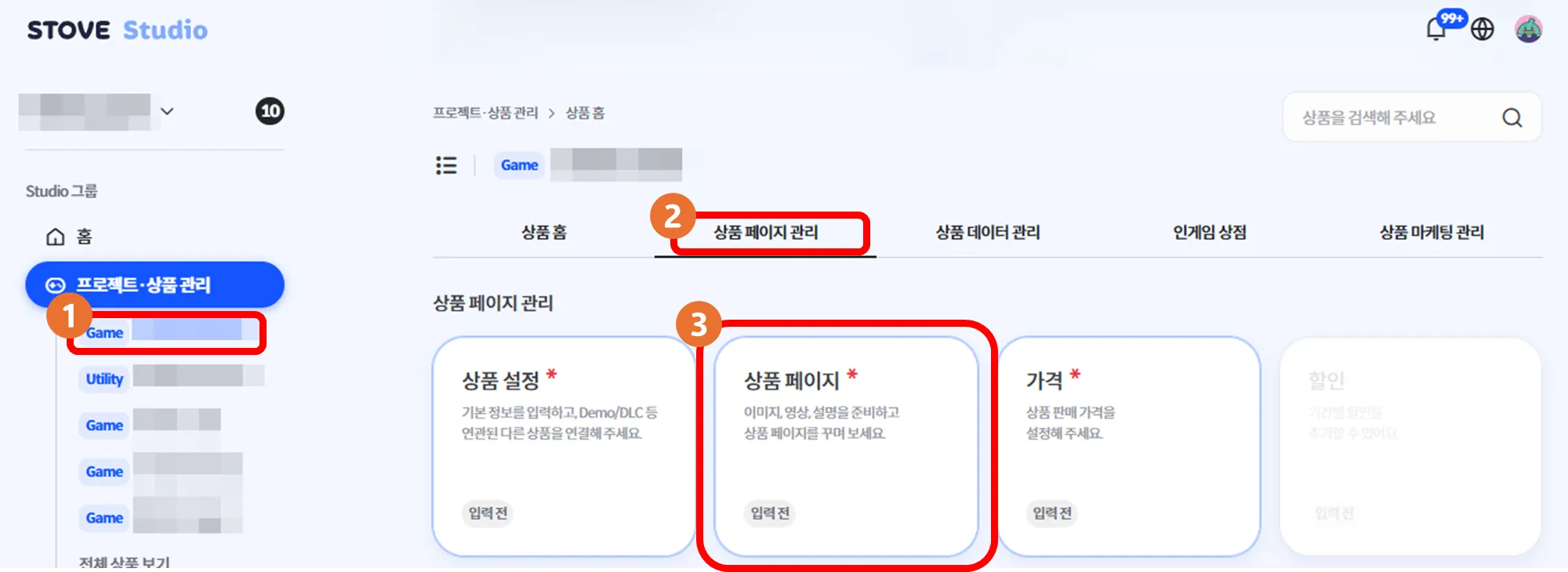 ① In Project · Product Management, select the product for which you want to create a product page → ② Product Page Management → ③ Product Page