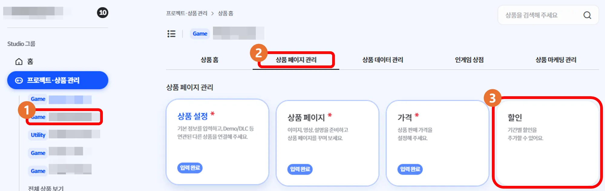 ① Select a product in Project/Product Management → ② Product Page Management → ③ Discount