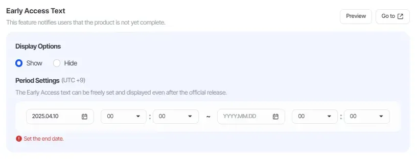 ※ Whether to display the Early Access message can be configured during the Release stage.
