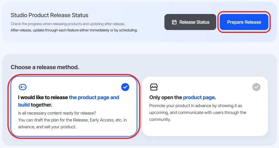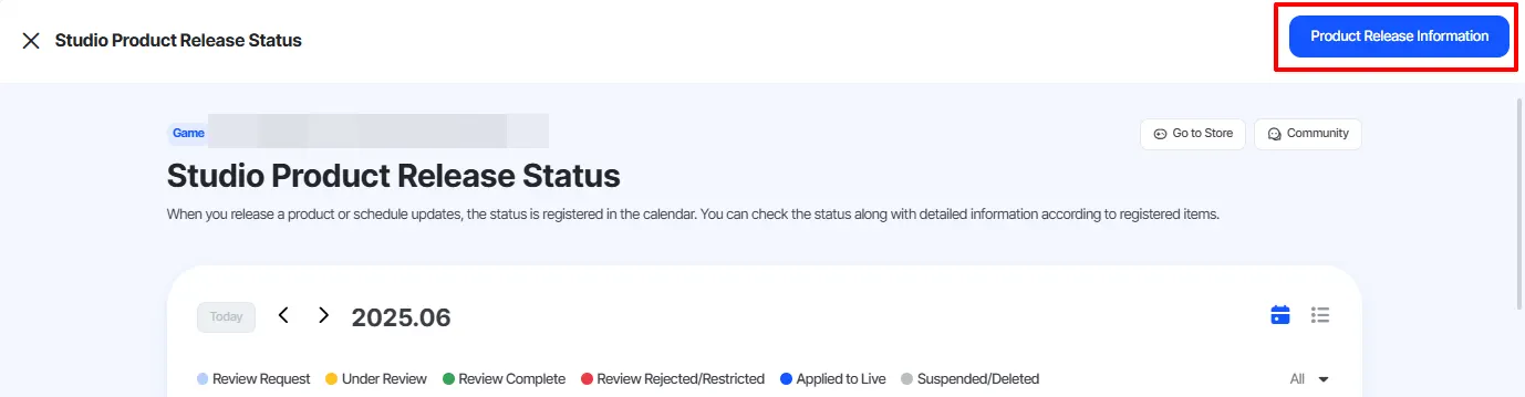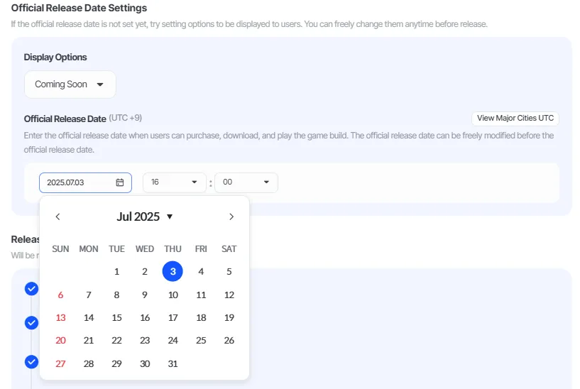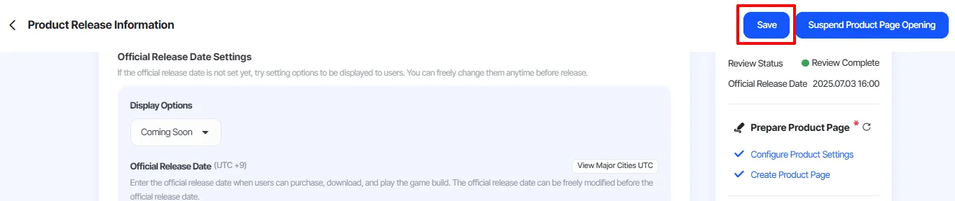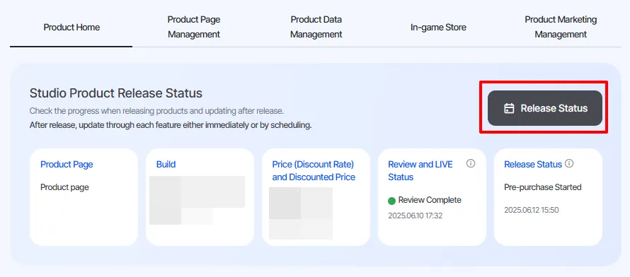 Release Plan | Set the product page opening date / official release date.Dates can be set starting one week later considering the review period.Pre-purchase can be configured. |