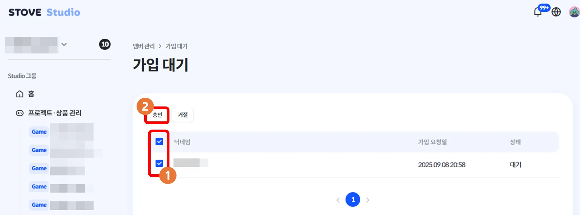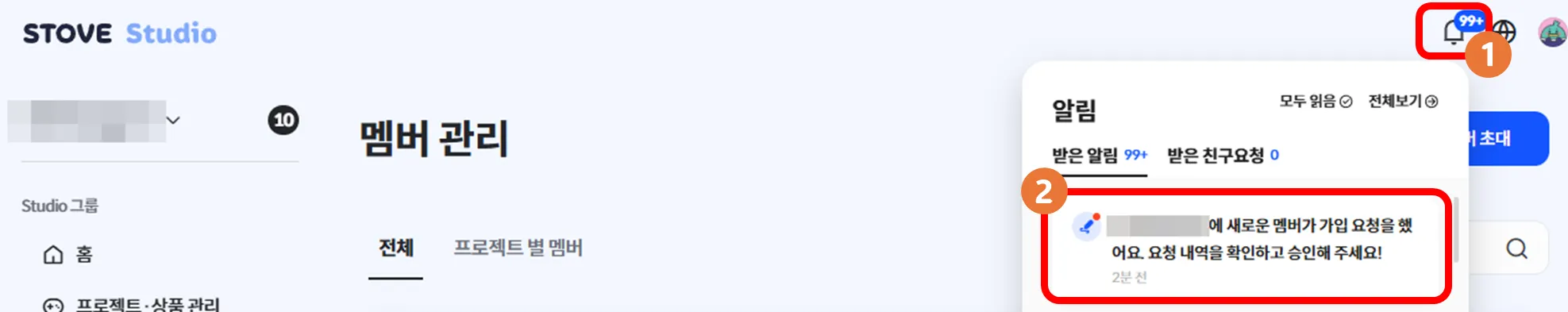 ❶ | If the invited person submits a join request, you can check the notification by clicking the notification icon at the top right of Studio Home. |