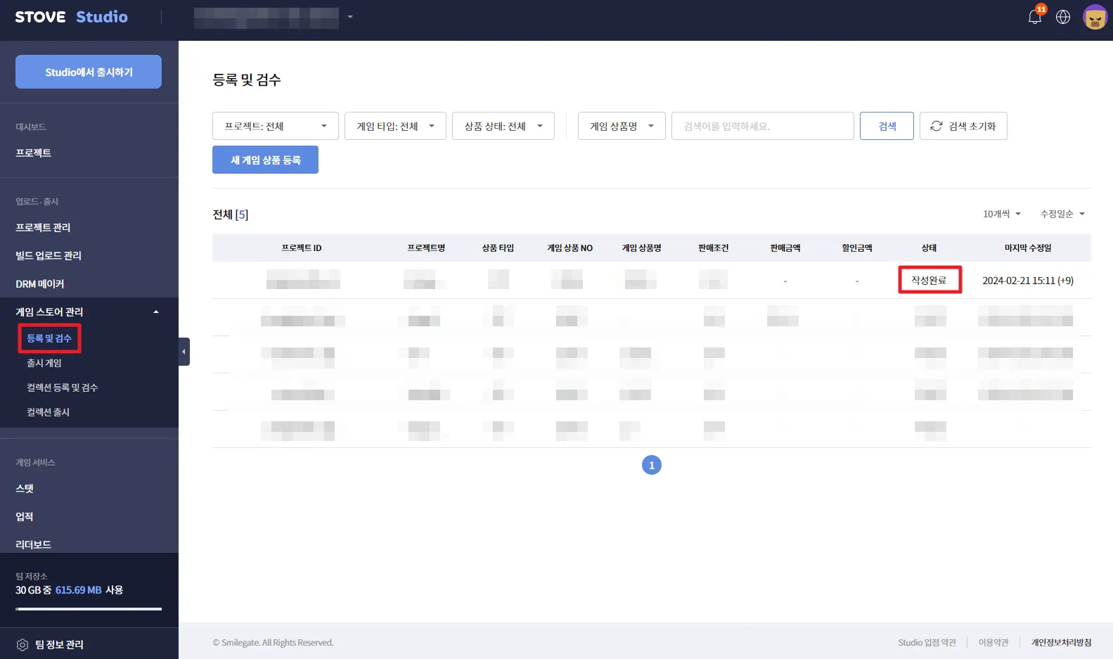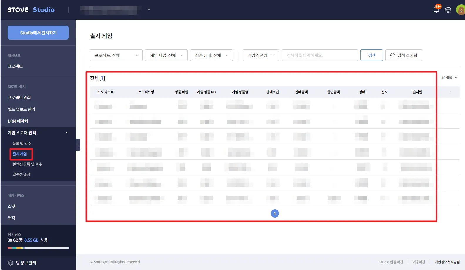 업데이트 하고자 하는 게임의 프로젝트를 찾습니다. 스토브 스튜디오의 게임 스토어 관리 ⇒ 출시 게임으로 이동합니다.