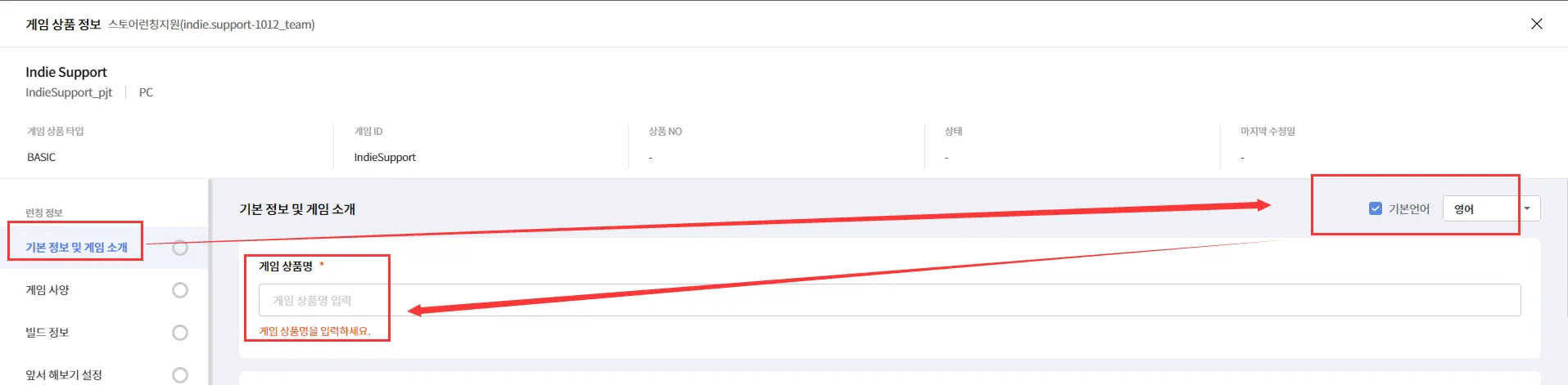 기본 정보 및 게임 소개 탭에서 기본언어를 영어로 선택하며 게임 상품명. 한 줄 소개, 게임 상세 설명, 스크린샷&동영상 등 항목을 영문으로 입력한 후 오른쪽 하단의 저장 버튼을 클릭합니다.
