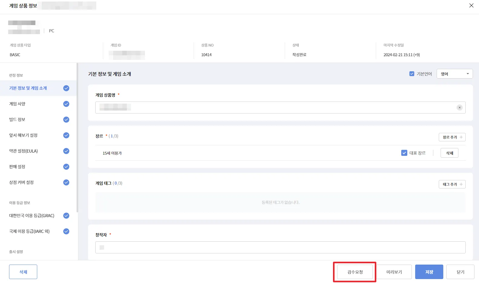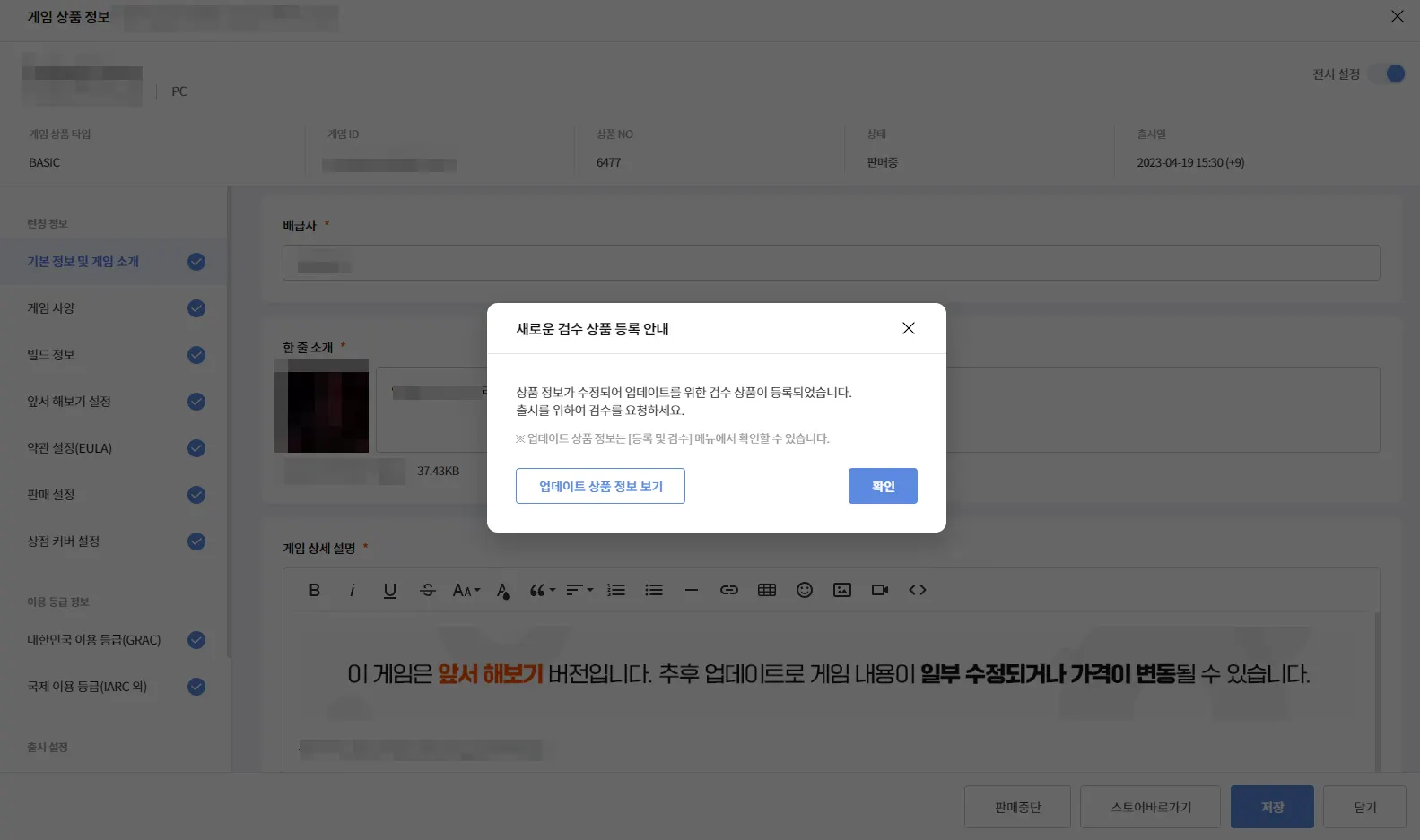 수정 이전 버전의 상점페이지는 출시 게임에 남습니다. 수정사항이 반영이 안된 것 같다면 등록 및 검수 요청 메뉴에서 보고 있는지 다시 확인해보세요.