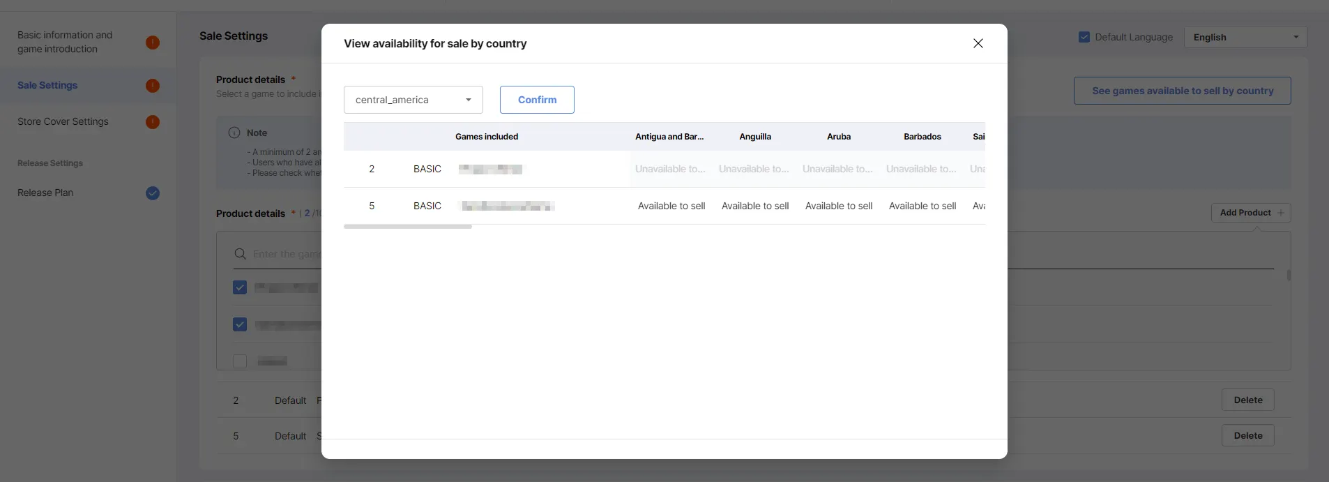 By clicking See games available to sell by country, you can check the country settings, default is global. (If you wish to change the country settings, contact STOVE.)