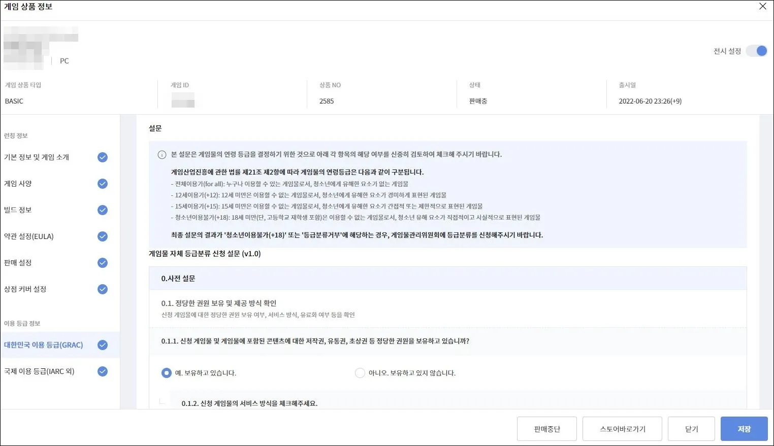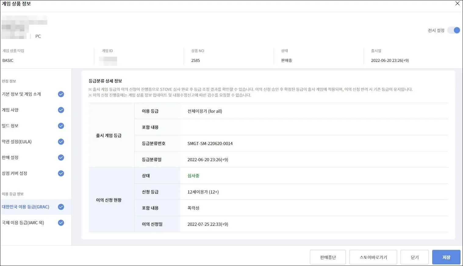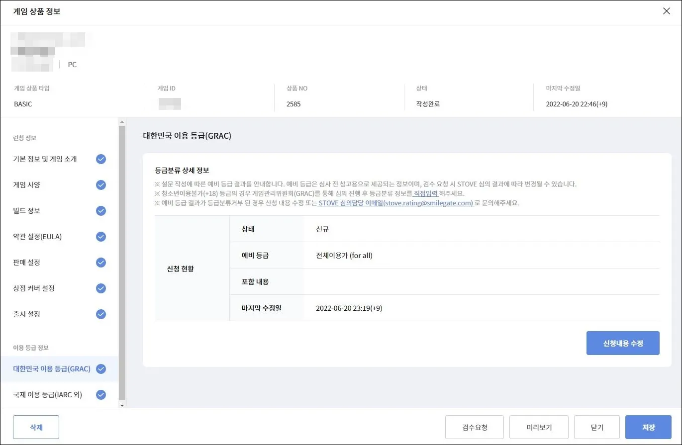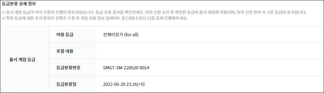 등급 심의가 완료되면, 확정된 등급 내역이 표시됩니다.