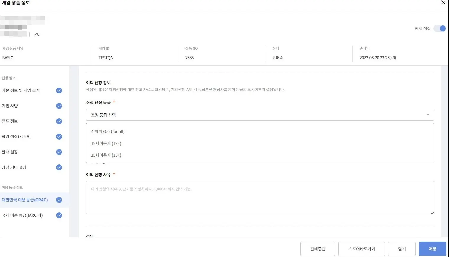 자체등급분류 심의 결과에 동의하지 못할 경우, 이의신청을 진행할 수 있습니다. 단, 프로젝트 별로 한차례만 진행 가능합니다.