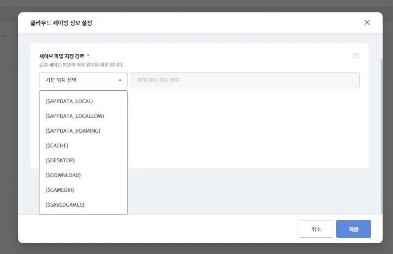기본 위치 선택에서 세이브 파일 저장 경로를 지정할 수 있습니다. 각 기본 위치 설정은 하단의 표를 확인 부탁드립니다.