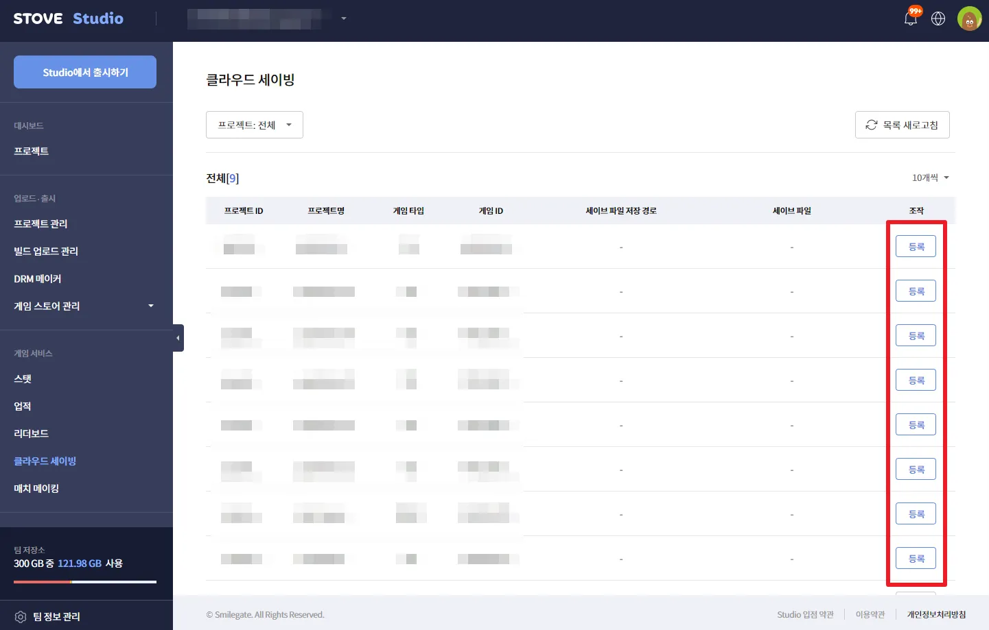 스토브 스튜디오에서, 좌측 게임 서비스 하단의 클라우드 세이빙을 클릭합니다. (하단 참고)