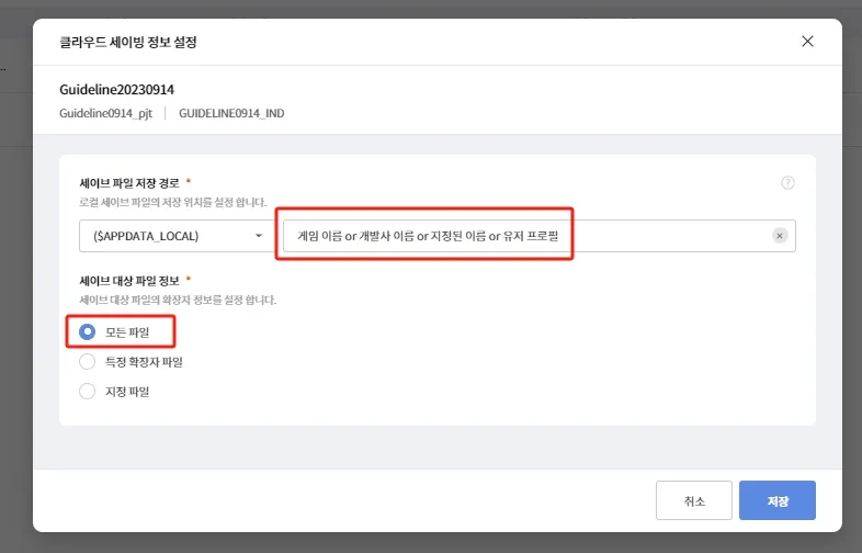 세이브 파일 저장 경로 설정 파일 저장 예시는 아래와 같습니다.