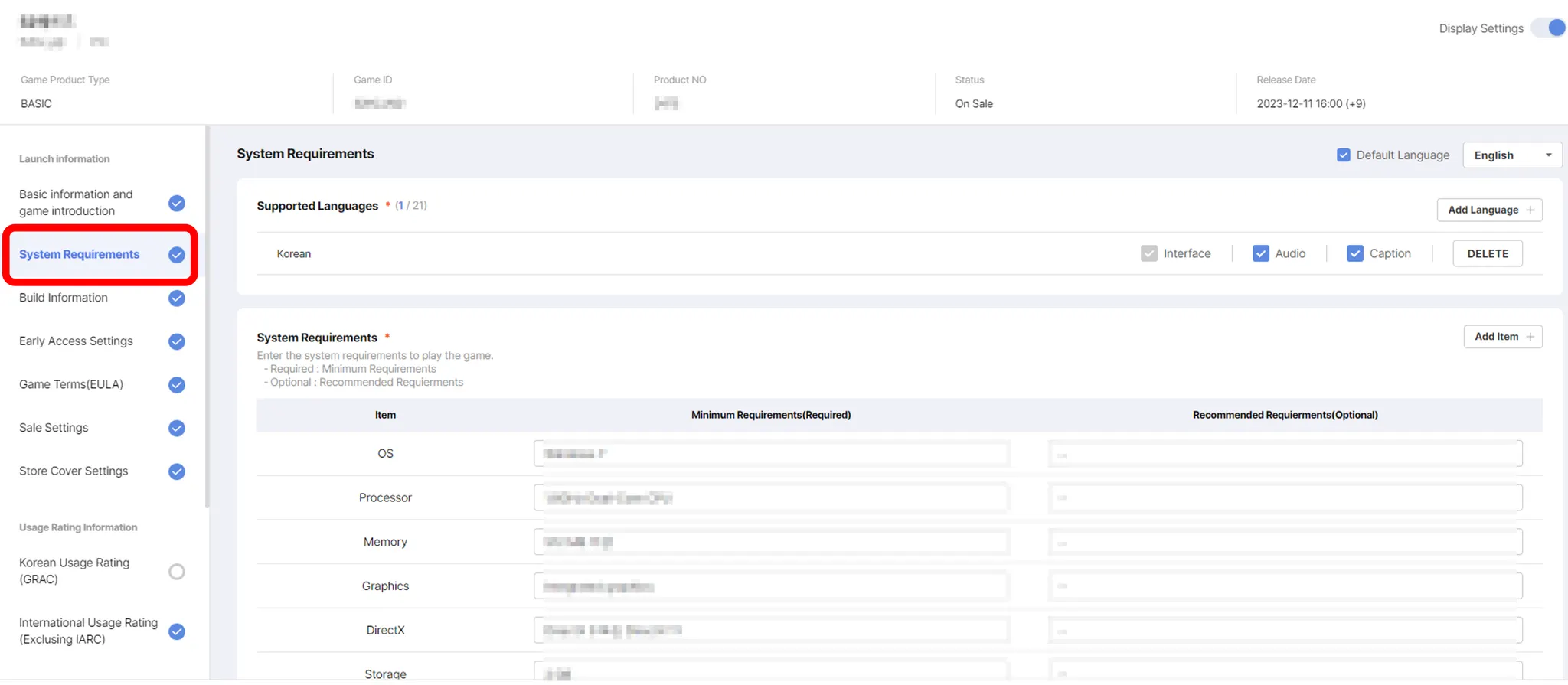 This section explains about the System Requirements section in STOVE Studio. You can select supported languages, minimum/recommended requirements, and supported features from your game.