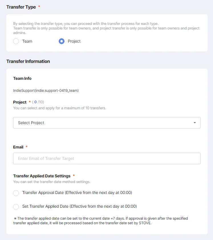 Note: Only Team Owners can submit Transfer Project.