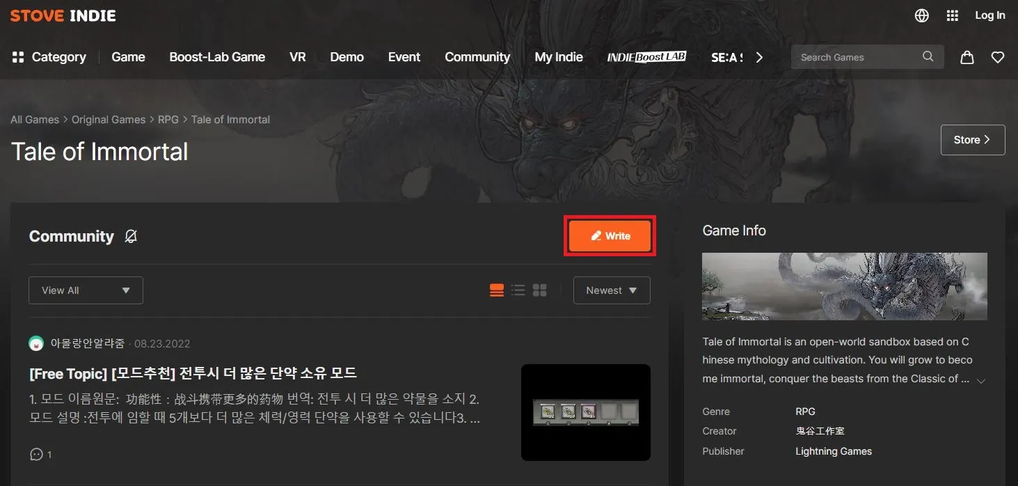 When a Store page is released in STOVE Store, a community for a game is automatically created. Community can be used as a place where publisher/developers communicate with the game’s players, or it can be used as a place where users can share their tips, and etc.