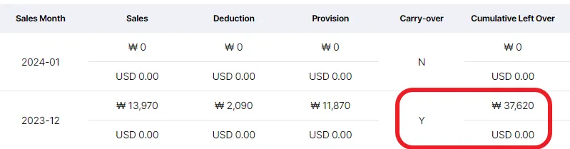 Suppose the Cumulative Left Over is less than USD 100 or equivalent in a given month, in this case, it is carried forward without transfer to the month; Carry-over will be also be marked with a Y in the Balance report. (see below)