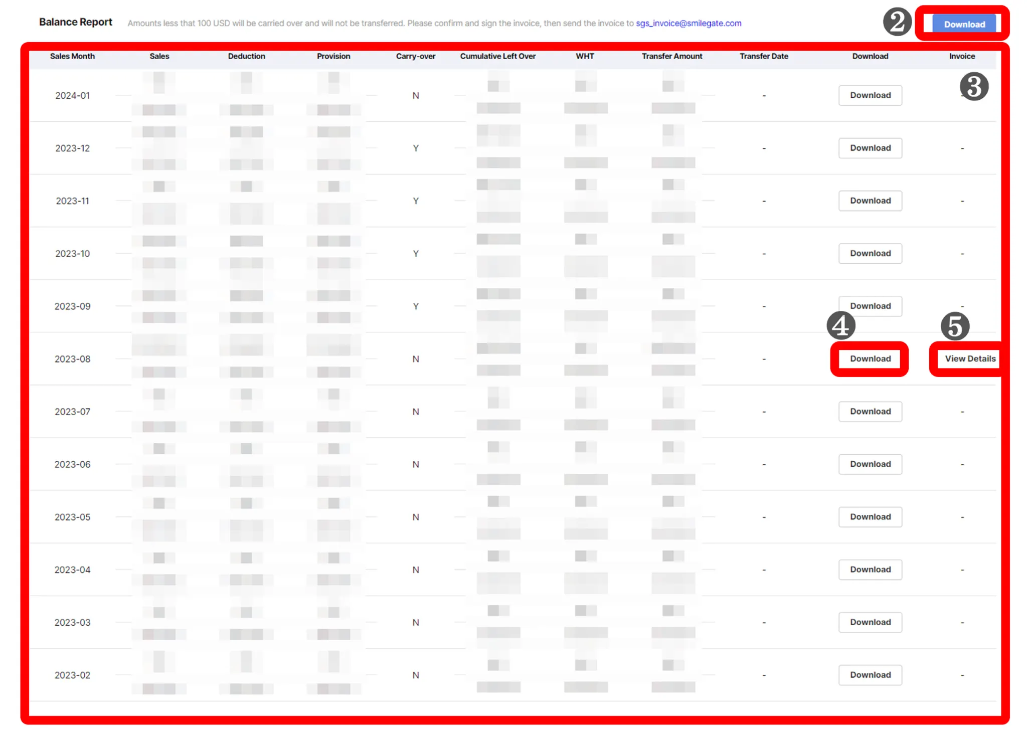 When the Cumulative Left Over equals or exceeds USD 100, you are now eligible to receive yout settlement. View Details button (under Invoice) should be activated, click to download your invoice, then sign, and lastly, send it to sgs_invoice@smilegate.com
