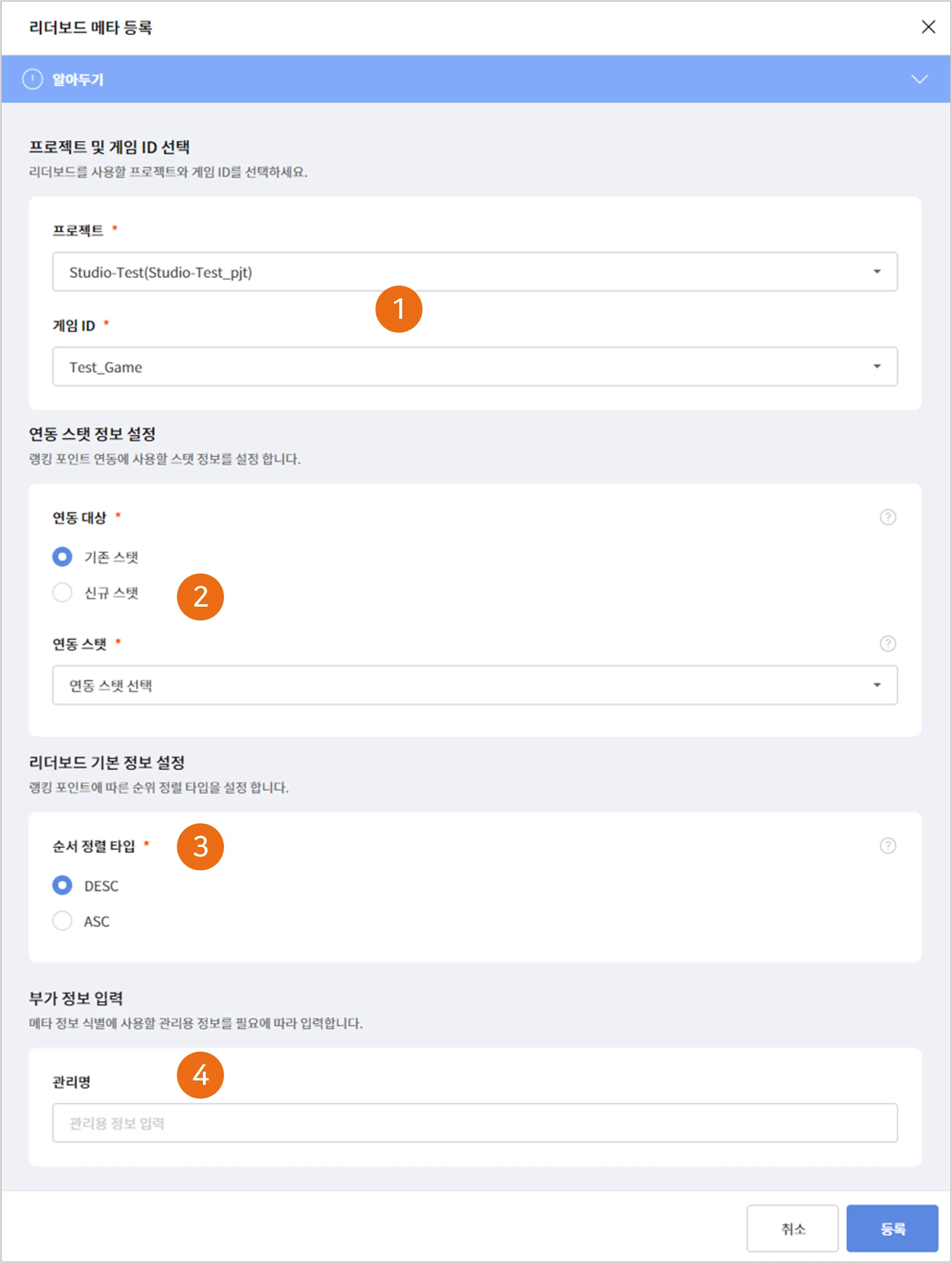 리더보드 메타 등록 팝업을 통해 리더보드 메타 데이터 추가가 가능합니다.