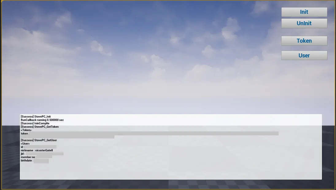 After build the HelloStove project, run it. When the UNREAL editor is running, press the Play button on the toolbar to run the demo and check if it usually works by pressing each button displayed on the screen in order.
