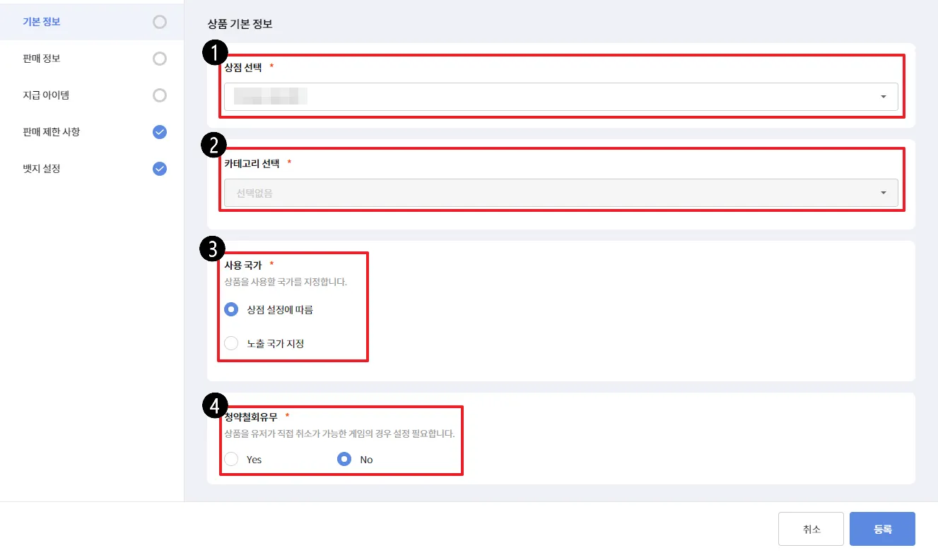 ❶ | 상품을 등록하는 상점을 선택합니다. |
