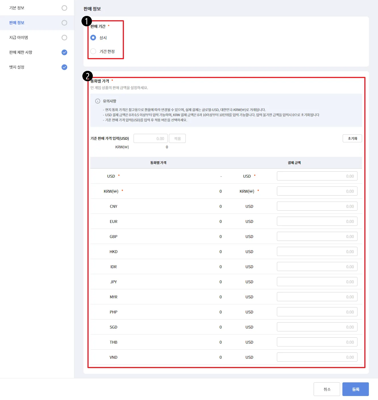 가격 정보, 판매 기간 등을 설정할 수 있습니다.