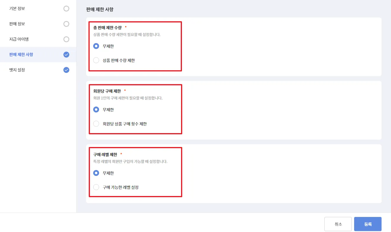 판매 제한 수량, 회원당 구매 제한, 레벨 제한 등을 설정할 수 있습니다.